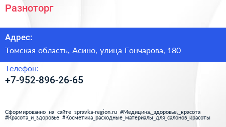 Разноторг по адресу Томская область, Асино, улица Гончарова, 180 в дальнейшем Организация, размещена в следующих категориях:
