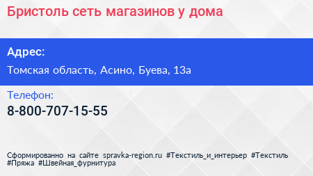 Бристоль, сеть магазинов у дома по адресу Томская область, Асино, Буева, 13а в дальнейшем Организация, размещена в следующих категориях:
