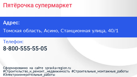 Пятёрочка, супермаркет по адресу Томская область, Асино, Станционная улица, 40/1 в дальнейшем Организация, размещена в следующих категориях:
