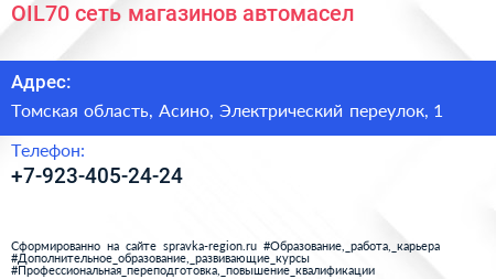 OIL70, сеть магазинов автомасел по адресу Томская область, Асино, Электрический переулок, 1 в дальнейшем Организация, размещена в следующих категориях: