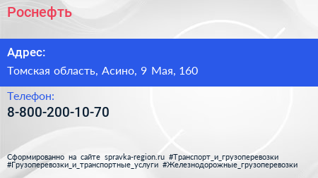 Роснефть по адресу Томская область, Асино, 9 Мая, 160 в дальнейшем Организация, размещена в следующих категориях: