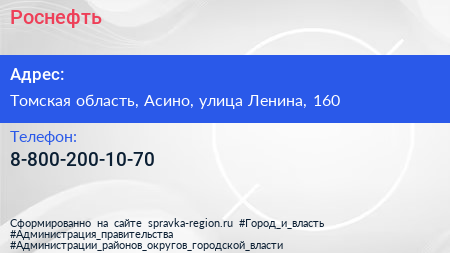 Роснефть по адресу Томская область, Асино, улица Ленина, 160 в дальнейшем Организация, размещена в следующих категориях: