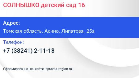 СОЛНЫШКО, детский сад №16 по адресу Томская область, Асино, Липатова, 25а в дальнейшем Организация, размещена в следующих категориях: