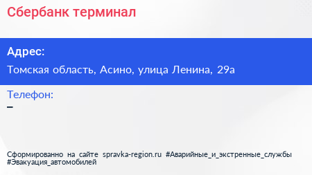 Сбербанк, терминал по адресу Томская область, Асино, улица Ленина, 29а в дальнейшем Организация, размещена в следующих категориях:
