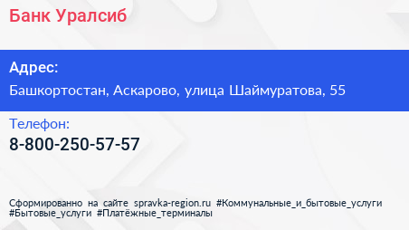 Банк Уралсиб по адресу Башкортостан, Аскарово, улица Шаймуратова, 55 в дальнейшем Организация, размещена в следующих категориях: