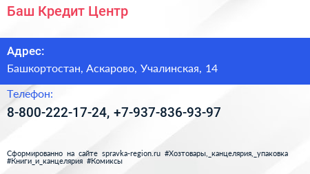 Баш-Кредит-Центр по адресу Башкортостан, Аскарово, Учалинская, 14 в дальнейшем Организация, размещена в следующих категориях: