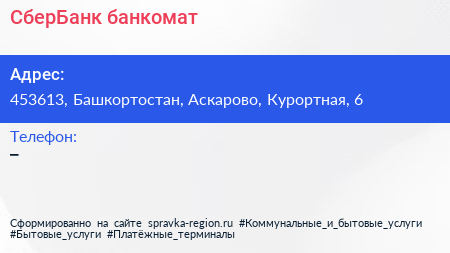 СберБанк, банкомат по адресу 453613, Башкортостан, Аскарово, Курортная, 6 в дальнейшем Организация, размещена в следующих категориях: