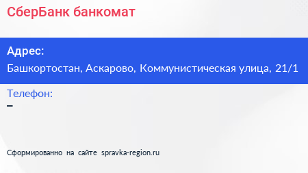 СберБанк, банкомат по адресу Башкортостан, Аскарово, Коммунистическая улица, 21/1 в дальнейшем Организация, размещена в следующих категориях:
