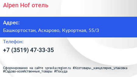 Alpen Hof, отель по адресу Башкортостан, Аскарово, Курортная, 55/3 в дальнейшем Организация, размещена в следующих категориях: