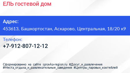 ЕЛЬ, гостевой дом по адресу 453613, Башкортостан, Аскарово, Центральная, 18/20 к9 в дальнейшем Организация, размещена в следующих категориях: