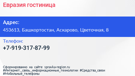 Евразия, гостиница по адресу 453613, Башкортостан, Аскарово, Цветочная, 8 в дальнейшем Организация, размещена в следующих категориях: