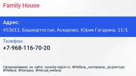 Family House по адресу 453613, Башкортостан, Аскарово, Юрия Гагарина, 11/1 в дальнейшем Организация, размещена в следующих категориях: