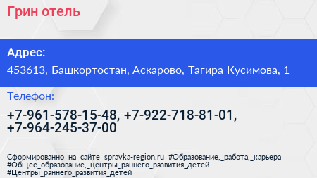 Грин, отель по адресу 453613, Башкортостан, Аскарово, Тагира Кусимова, 1 в дальнейшем Организация, размещена в следующих категориях: