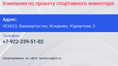 Компания по прокату спортивного инвентаря по адресу 453613, Башкортостан, Аскарово, Курортная, 5 в дальнейшем Организация, размещена в следующих категориях: