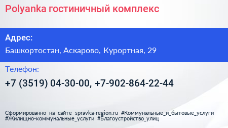 Polyanka, гостиничный комплекс по адресу Башкортостан, Аскарово, Курортная, 29 в дальнейшем Организация, размещена в следующих категориях: