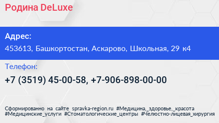 Родина DeLuxe по адресу 453613, Башкортостан, Аскарово, Школьная, 29 к4 в дальнейшем Организация, размещена в следующих категориях: