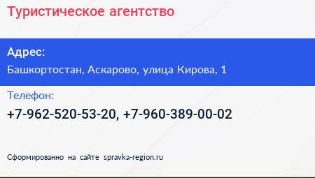 Туристическое агентство по адресу Башкортостан, Аскарово, улица Кирова, 1 в дальнейшем Организация, размещена в следующих категориях: