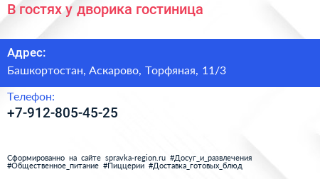 В гостях у дворика, гостиница по адресу Башкортостан, Аскарово, Торфяная, 11/3 в дальнейшем Организация, размещена в следующих категориях: