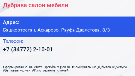 Дубрава, салон мебели по адресу Башкортостан, Аскарово, Рауфа Давлетова, 8/3 в дальнейшем Организация, размещена в следующих категориях: