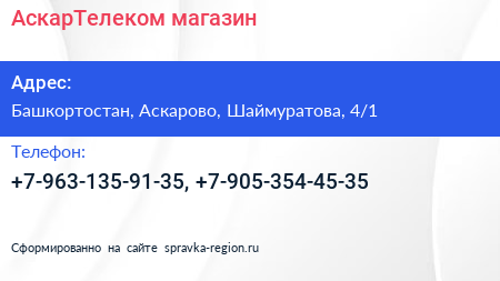 АскарТелеком, магазин по адресу Башкортостан, Аскарово, Шаймуратова, 4/1 в дальнейшем Организация, размещена в следующих категориях: