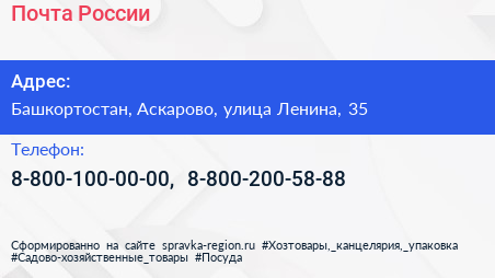 Почта России по адресу Башкортостан, Аскарово, улица Ленина, 35 в дальнейшем Организация, размещена в следующих категориях: