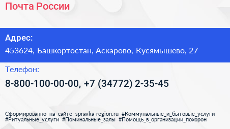 Почта России по адресу 453624, Башкортостан, Аскарово, Кусямышево, 27 в дальнейшем Организация, размещена в следующих категориях: