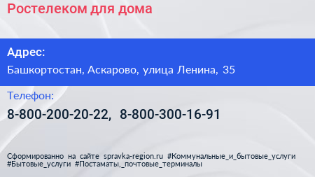 Ростелеком для дома по адресу Башкортостан, Аскарово, улица Ленина, 35 в дальнейшем Организация, размещена в следующих категориях: