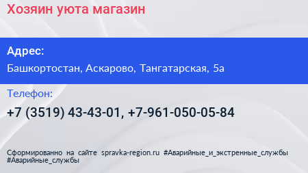 Хозяин уюта, магазин по адресу Башкортостан, Аскарово, Тангатарская, 5а в дальнейшем Организация, размещена в следующих категориях: