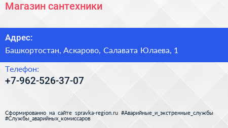 Магазин сантехники по адресу Башкортостан, Аскарово, Салавата Юлаева, 1 в дальнейшем Организация, размещена в следующих категориях: