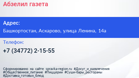 Абзелил, газета по адресу Башкортостан, Аскарово, улица Ленина, 14а в дальнейшем Организация, размещена в следующих категориях: