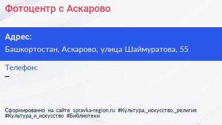 Фотоцентр, с. Аскарово по адресу Башкортостан, Аскарово, улица Шаймуратова, 55 в дальнейшем Организация, размещена в следующих категориях: