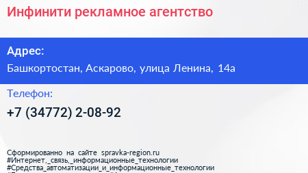 Инфинити, рекламное агентство по адресу Башкортостан, Аскарово, улица Ленина, 14а в дальнейшем Организация, размещена в следующих категориях: