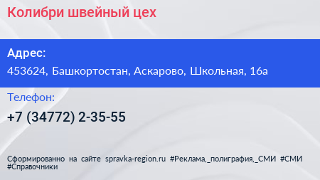 Колибри, швейный цех по адресу 453624, Башкортостан, Аскарово, Школьная, 16а в дальнейшем Организация, размещена в следующих категориях: