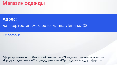 Магазин одежды по адресу Башкортостан, Аскарово, улица Ленина, 33 в дальнейшем Организация, размещена в следующих категориях: