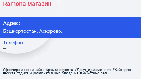 Ramona, магазин по адресу Башкортостан, Аскарово, в дальнейшем Организация, размещена в следующих категориях: