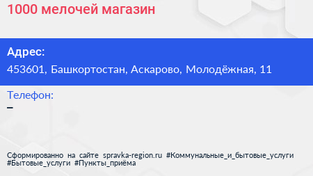 1000 мелочей, магазин по адресу 453601, Башкортостан, Аскарово, Молодёжная, 11 в дальнейшем Организация, размещена в следующих категориях: