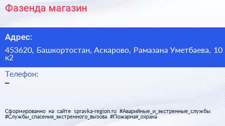 Фазенда, магазин по адресу 453620, Башкортостан, Аскарово, Рамазана Уметбаева, 10 к2 в дальнейшем Организация, размещена в следующих категориях: