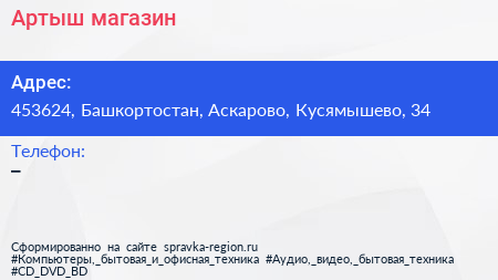 Артыш, магазин по адресу 453624, Башкортостан, Аскарово, Кусямышево, 34 в дальнейшем Организация, размещена в следующих категориях: