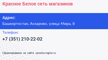 Красное & Белое, сеть магазинов по адресу Башкортостан, Аскарово, улица Мира, 8 в дальнейшем Организация, размещена в следующих категориях: