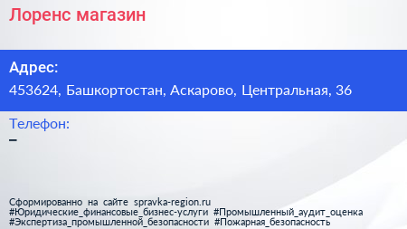 Лоренс, магазин по адресу 453624, Башкортостан, Аскарово, Центральная, 36 в дальнейшем Организация, размещена в следующих категориях: