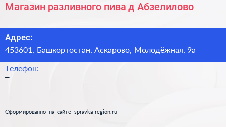 Магазин разливного пива, д. Абзелилово по адресу 453601, Башкортостан, Аскарово, Молодёжная, 9а в дальнейшем Организация, размещена в следующих категориях: