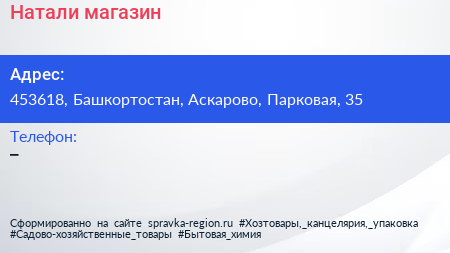 Натали, магазин по адресу 453618, Башкортостан, Аскарово, Парковая, 35 в дальнейшем Организация, размещена в следующих категориях: