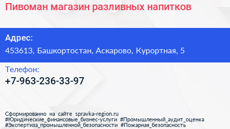 Пивоман, магазин разливных напитков по адресу 453613, Башкортостан, Аскарово, Курортная, 5 в дальнейшем Организация, размещена в следующих категориях: