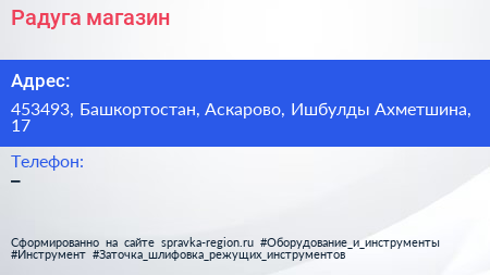 Радуга, магазин по адресу 453493, Башкортостан, Аскарово, Ишбулды Ахметшина, 17 в дальнейшем Организация, размещена в следующих категориях: