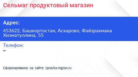 Сельмаг, продуктовый магазин по адресу 453622, Башкортостан, Аскарово, Файзрахмана Хизматуллина, 55 в дальнейшем Организация, размещена в следующих категориях: