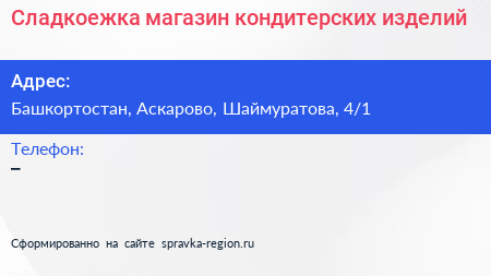 Сладкоежка, магазин кондитерских изделий по адресу Башкортостан, Аскарово, Шаймуратова, 4/1 в дальнейшем Организация, размещена в следующих категориях: