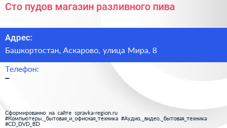 Сто пудов, магазин разливного пива по адресу Башкортостан, Аскарово, улица Мира, 8 в дальнейшем Организация, размещена в следующих категориях: