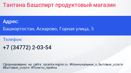 Тантана-Башспирт, продуктовый магазин по адресу Башкортостан, Аскарово, Горная улица, 5 в дальнейшем Организация, размещена в следующих категориях: