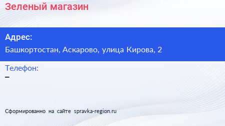 Зеленый, магазин по адресу Башкортостан, Аскарово, улица Кирова, 2 в дальнейшем Организация, размещена в следующих категориях: