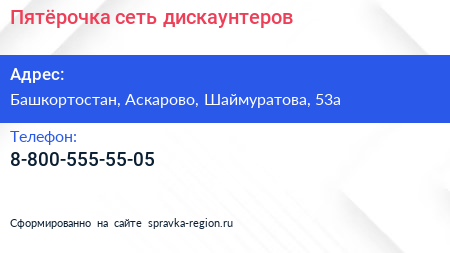 Пятёрочка, сеть дискаунтеров по адресу Башкортостан, Аскарово, Шаймуратова, 53а в дальнейшем Организация, размещена в следующих категориях: